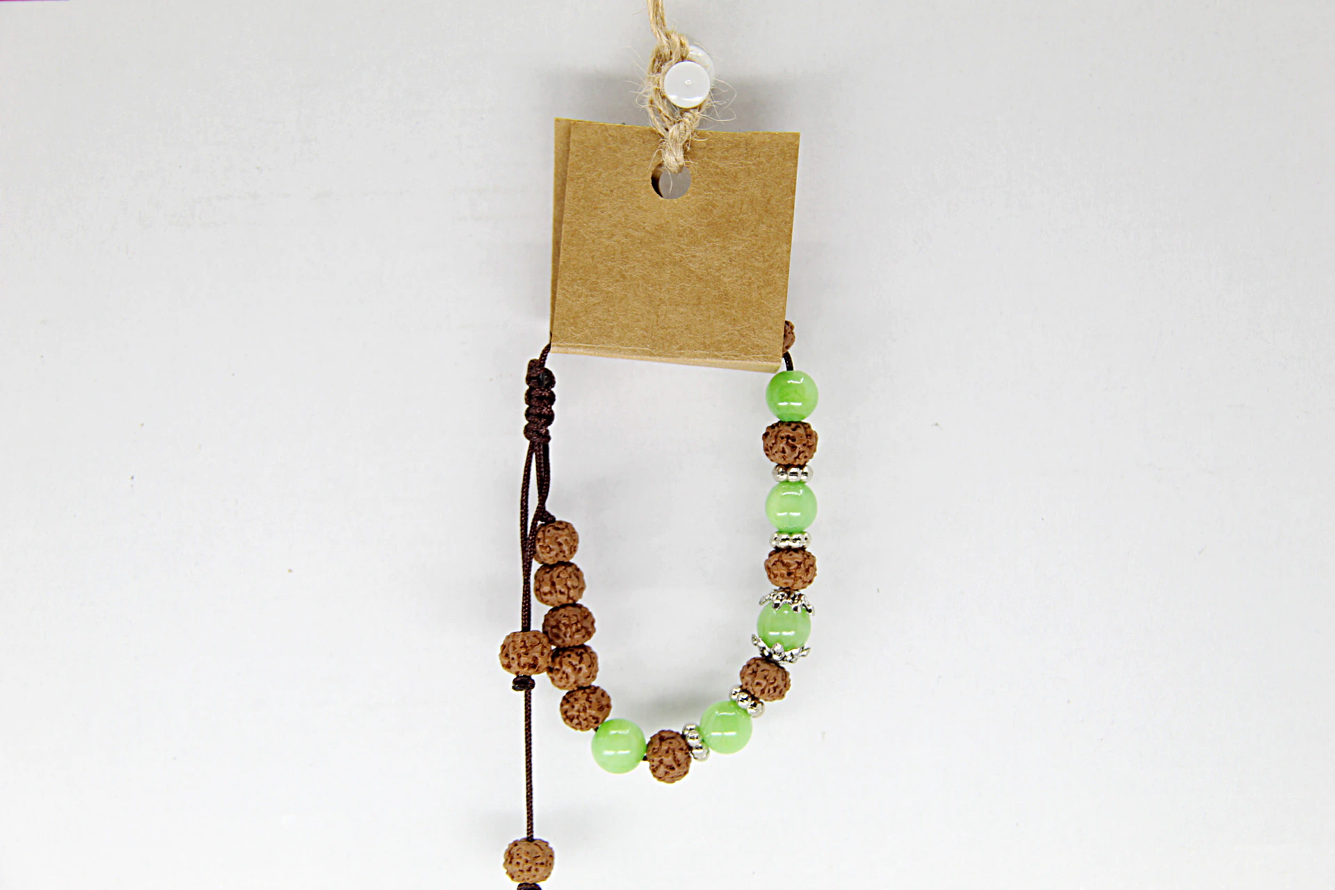 Esta pulseira junta a famosa semente de rudraksha com a elegante ágata verde.