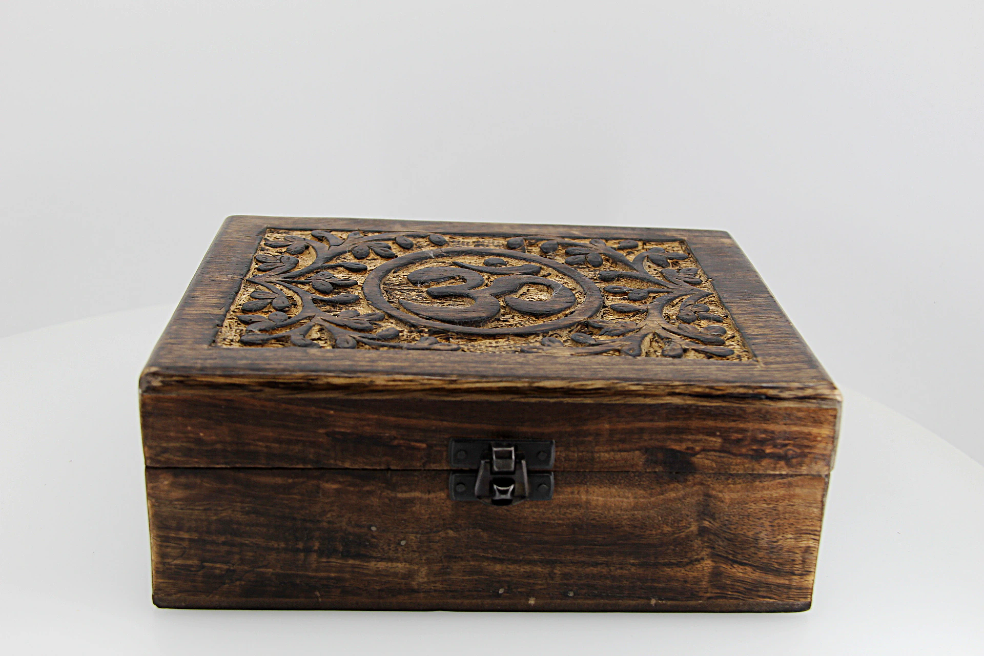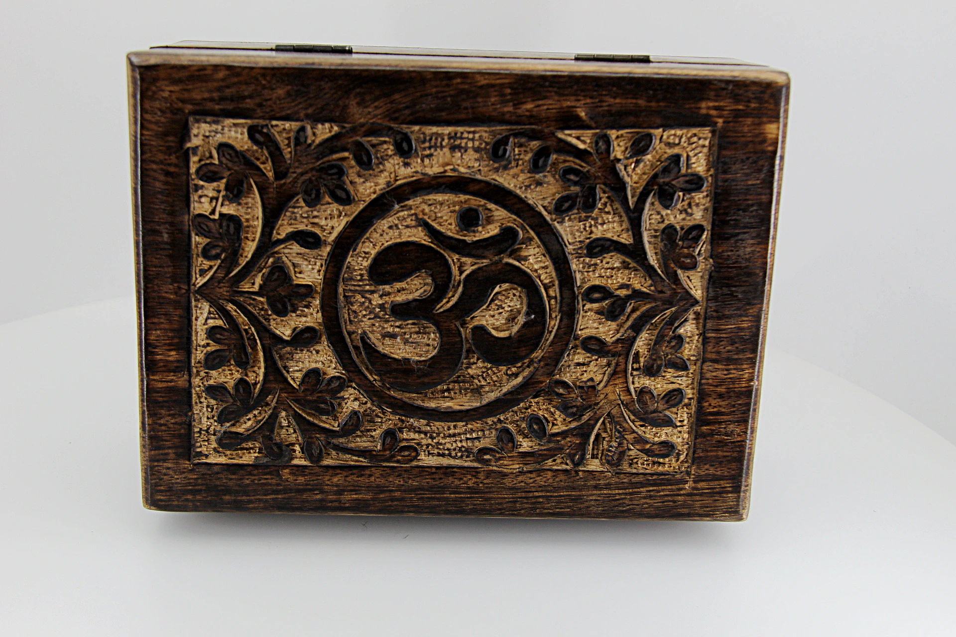 Caixa decorativa em madeira com relevo do símbolo OM, representação universal do som primordial, da unidade e da conexão espiritual. Ideal para guardar pequenos objetos pessoais, cristais, joias ou itens de valor simbólico.