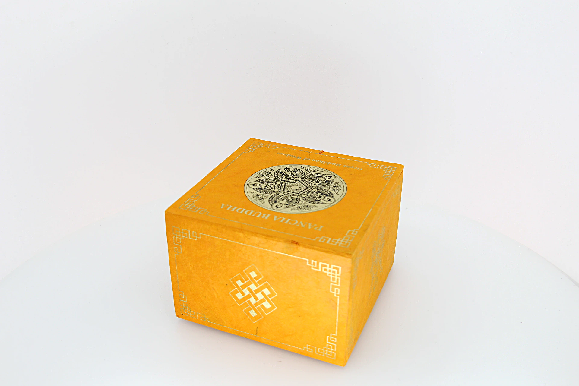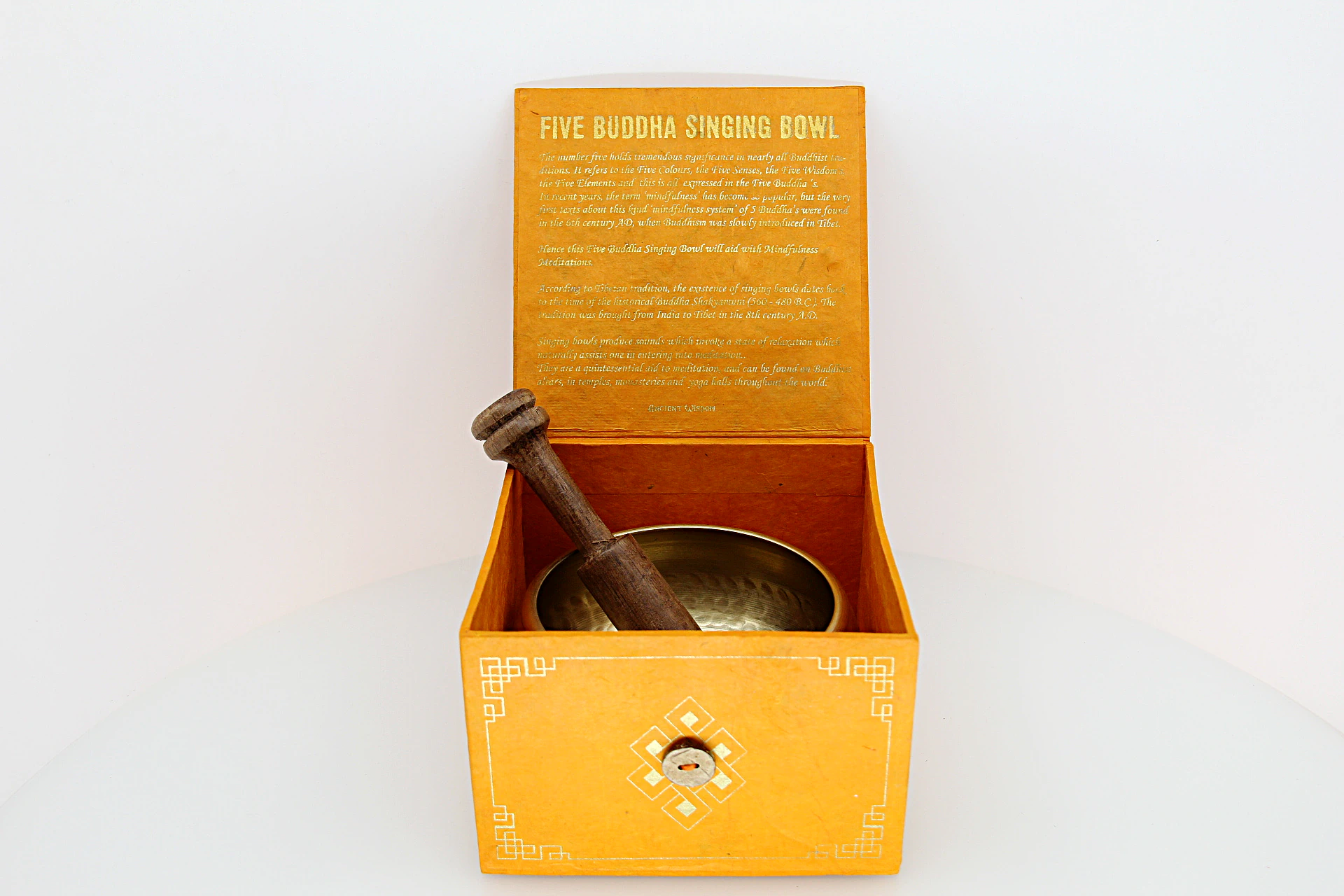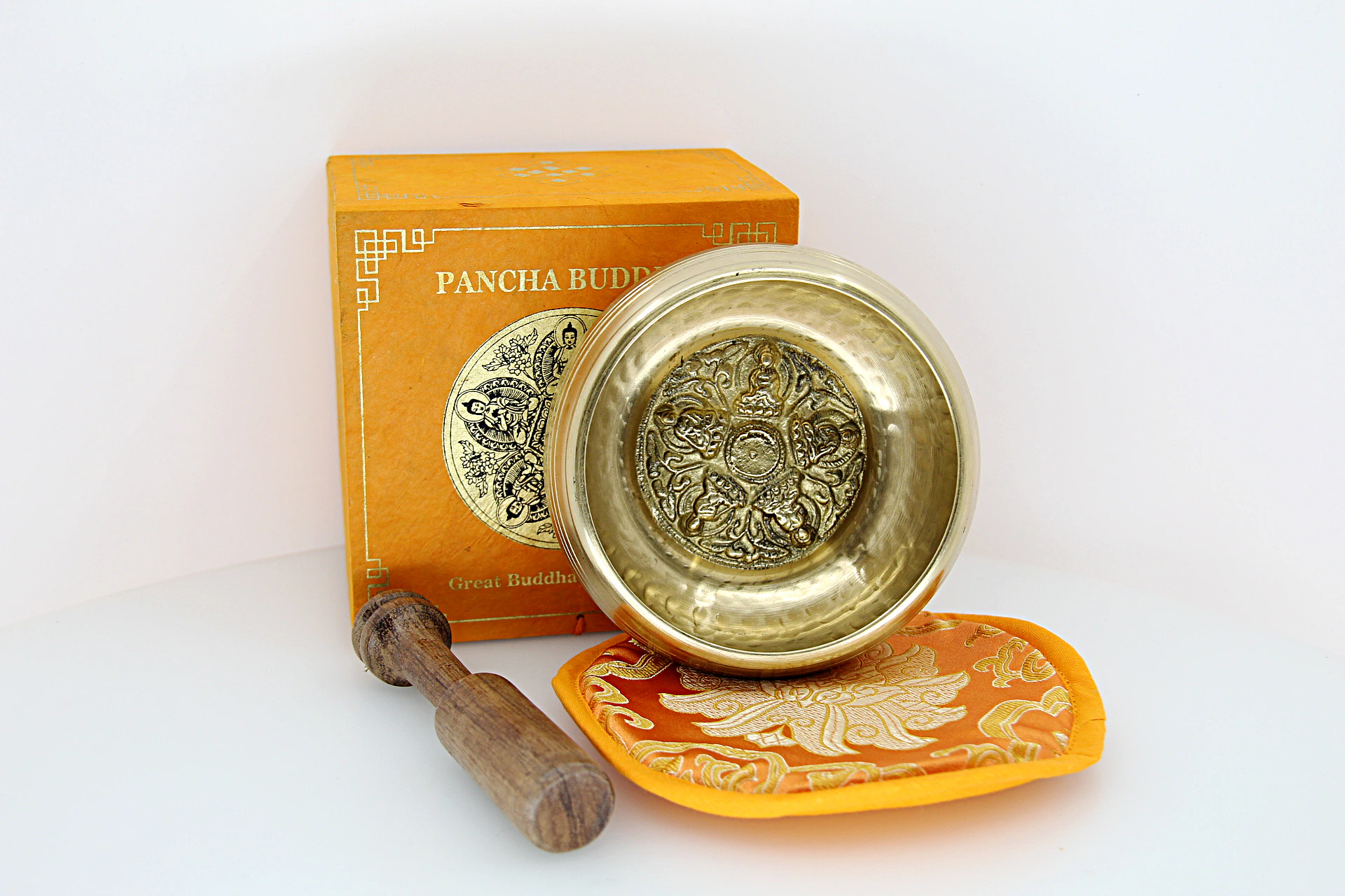 Taça tibetana em metal com gravações dos 5 Budas, simbolo de harmonia e proteção. Inclui almofada, bastão em madeira e caixa decorada.