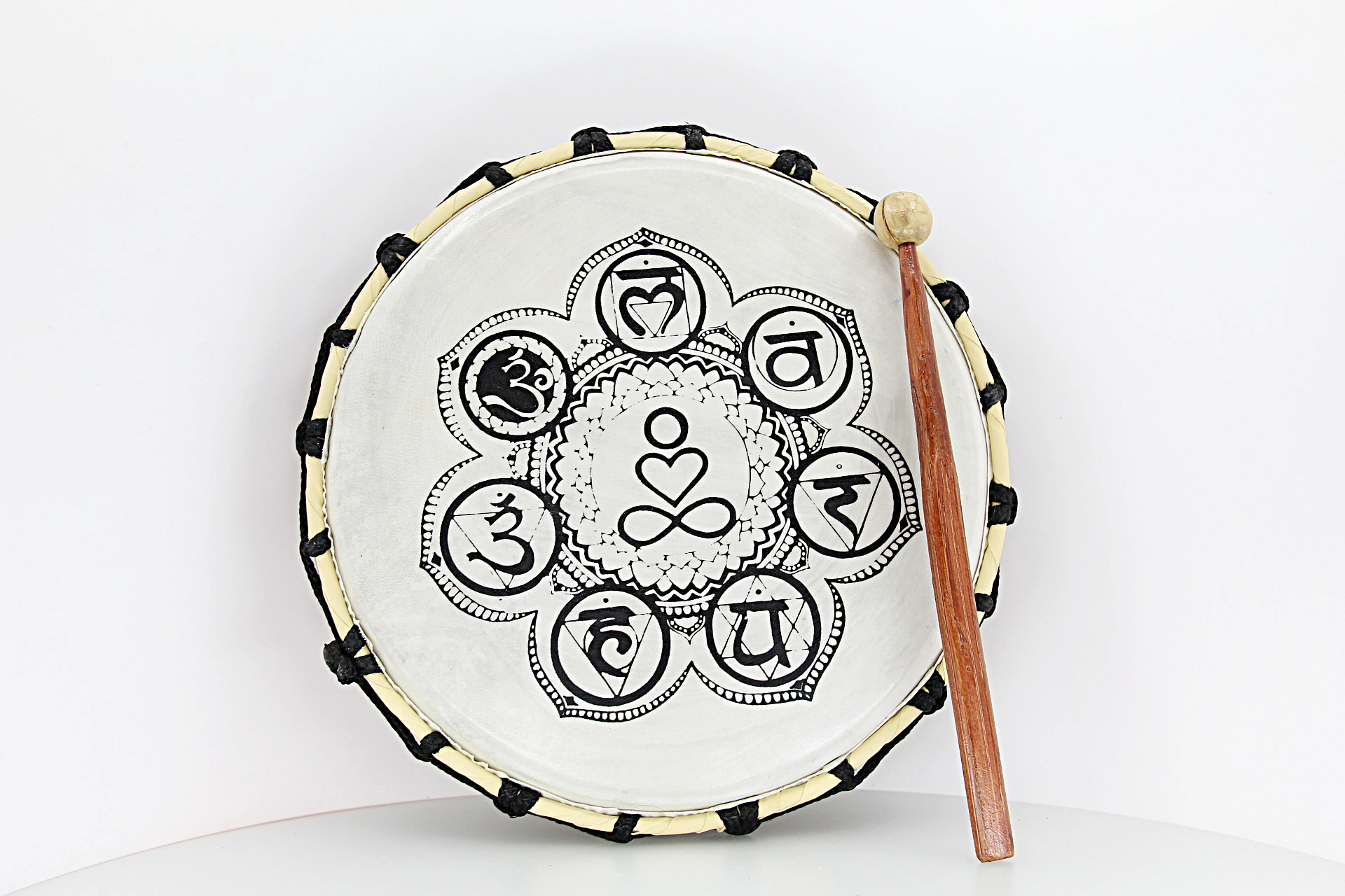Tambor xamânico é inspirado na energia dos sete chakras, usado em práticas xamânicas, meditação e cura vibracional.