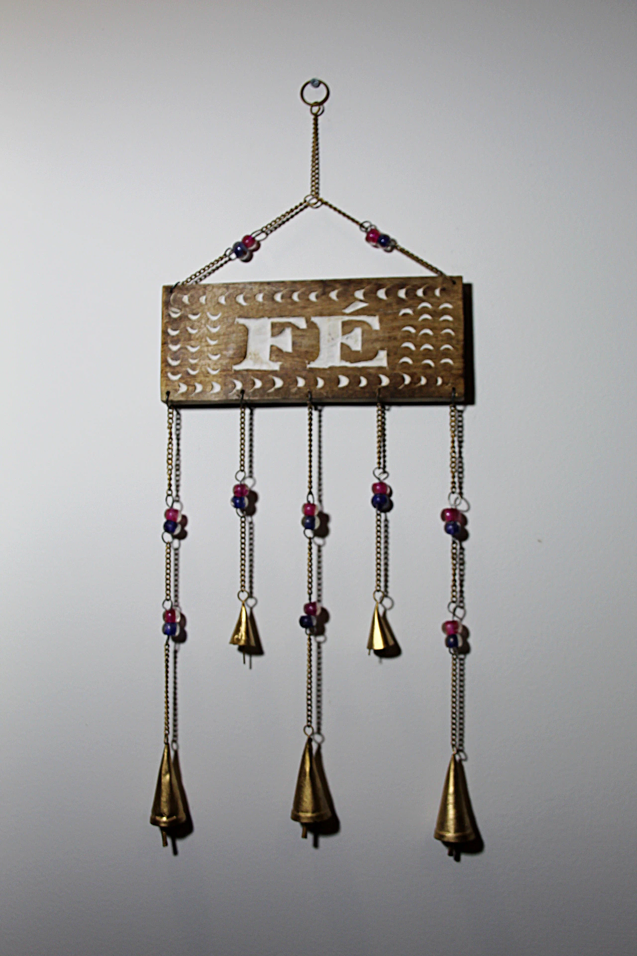 Placa de madeira com a palavra “Fé”, ideal para transmitir esperança e força interior no ambiente.