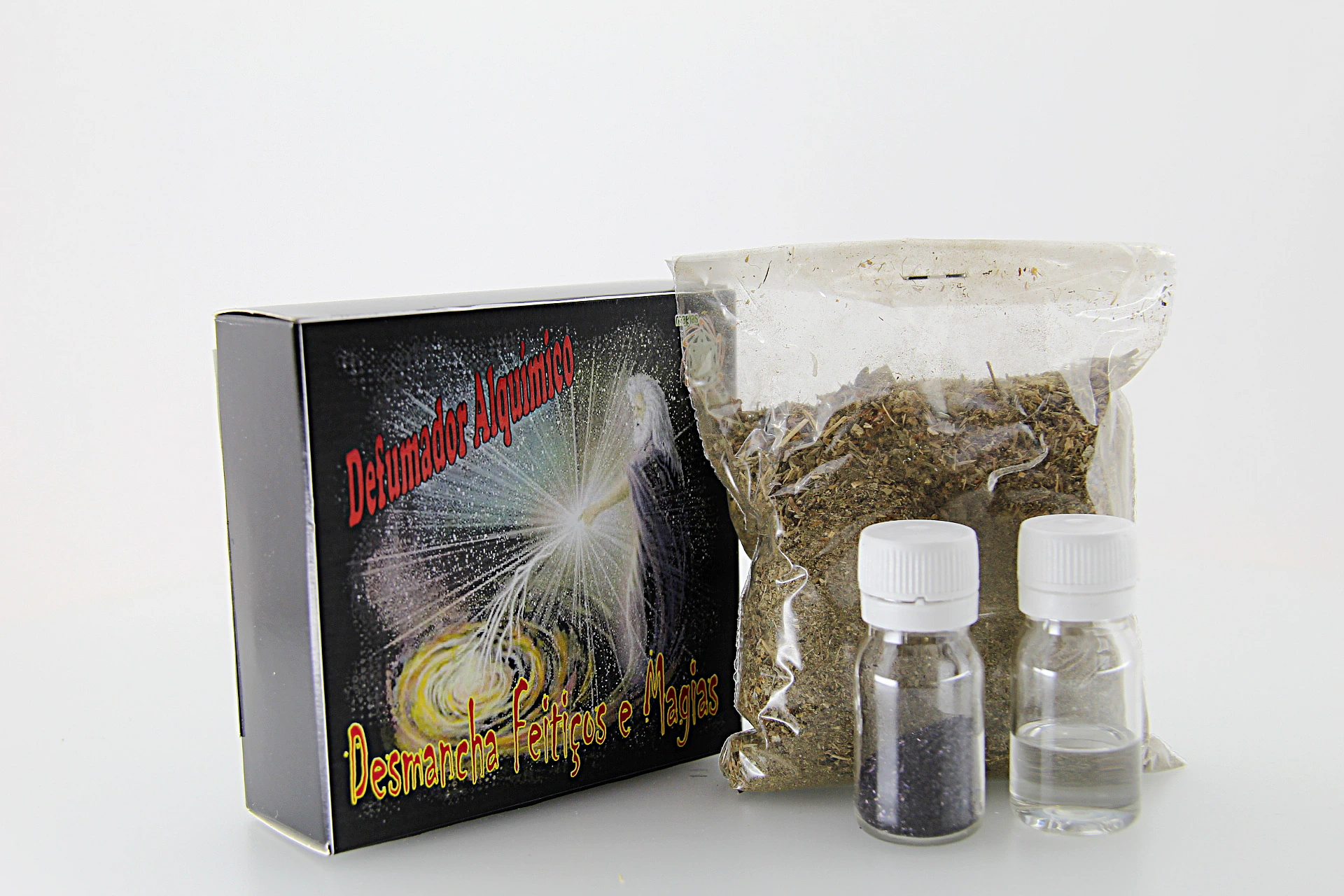 Cada kit contém um pacote de ervas, um frasco de óleo e um frasco de pó, especialmente preparados para práticas espirituais.