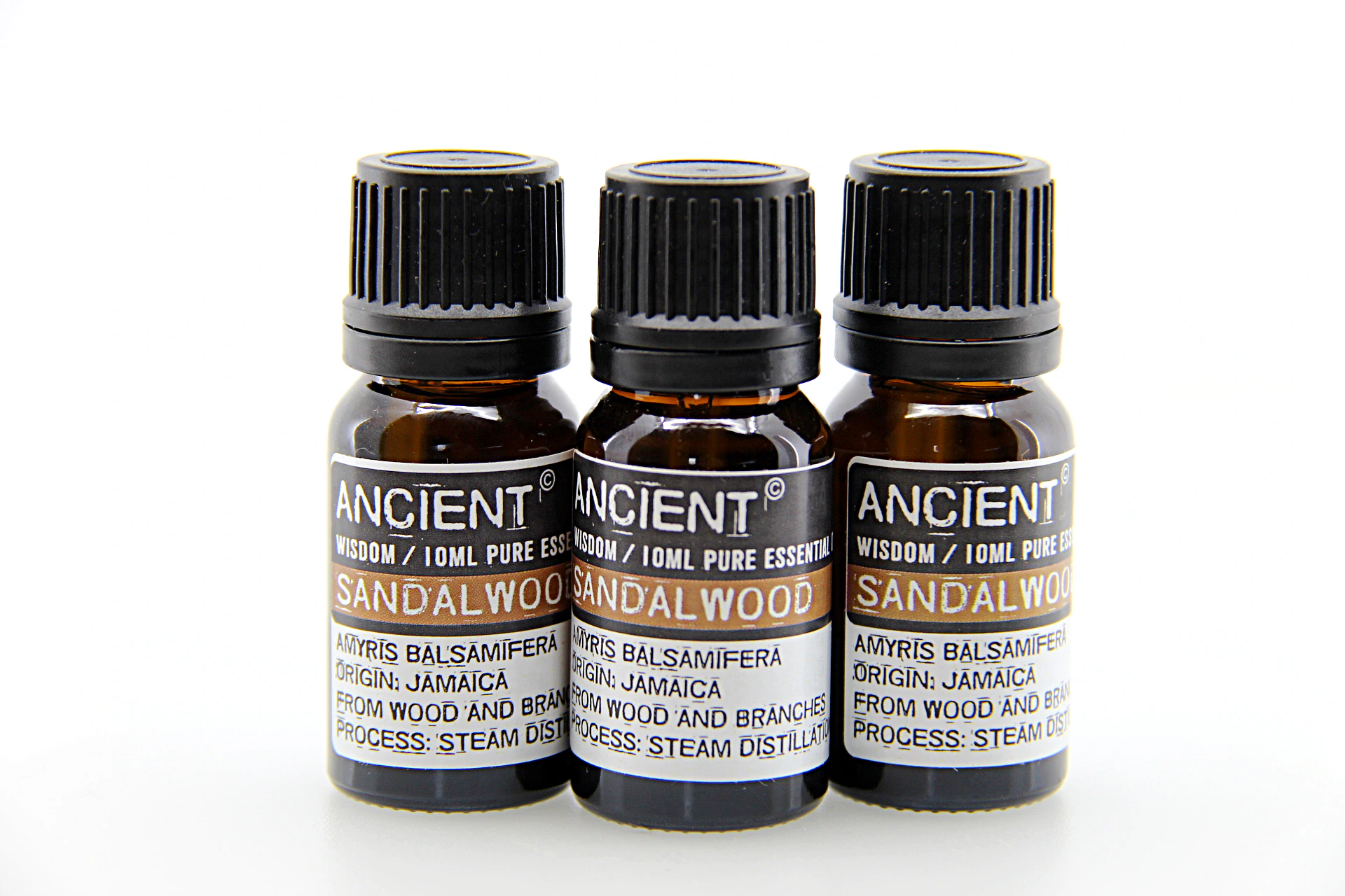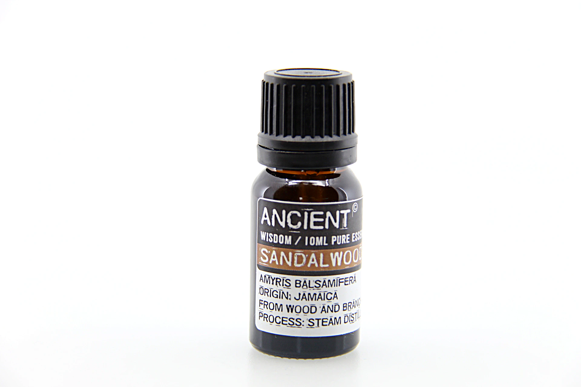 Óleo essencial de sândalo, tradicionalmente utilizado em rituais de meditação, proteção e conexão espiritual.