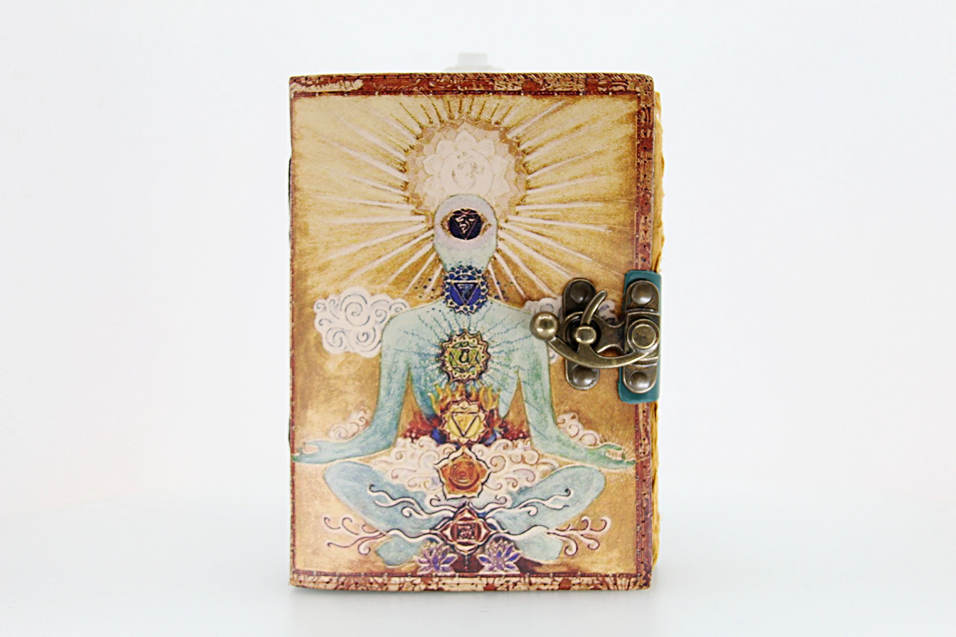 Caderno artesanal em pele com símbolos dos sete chakras, que inspira harmonia, autoconhecimento e equilíbrio energético.