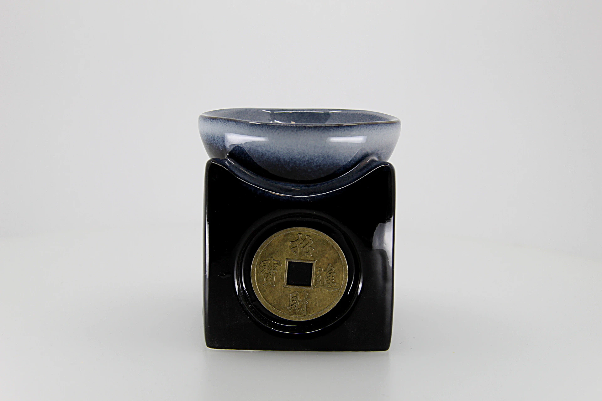 Ao aquecer o aroma escolhido, o queimador liberta uma vibração suave que purifica o ambiente, enquanto a moeda representa abertura ao fluxo de abundância.