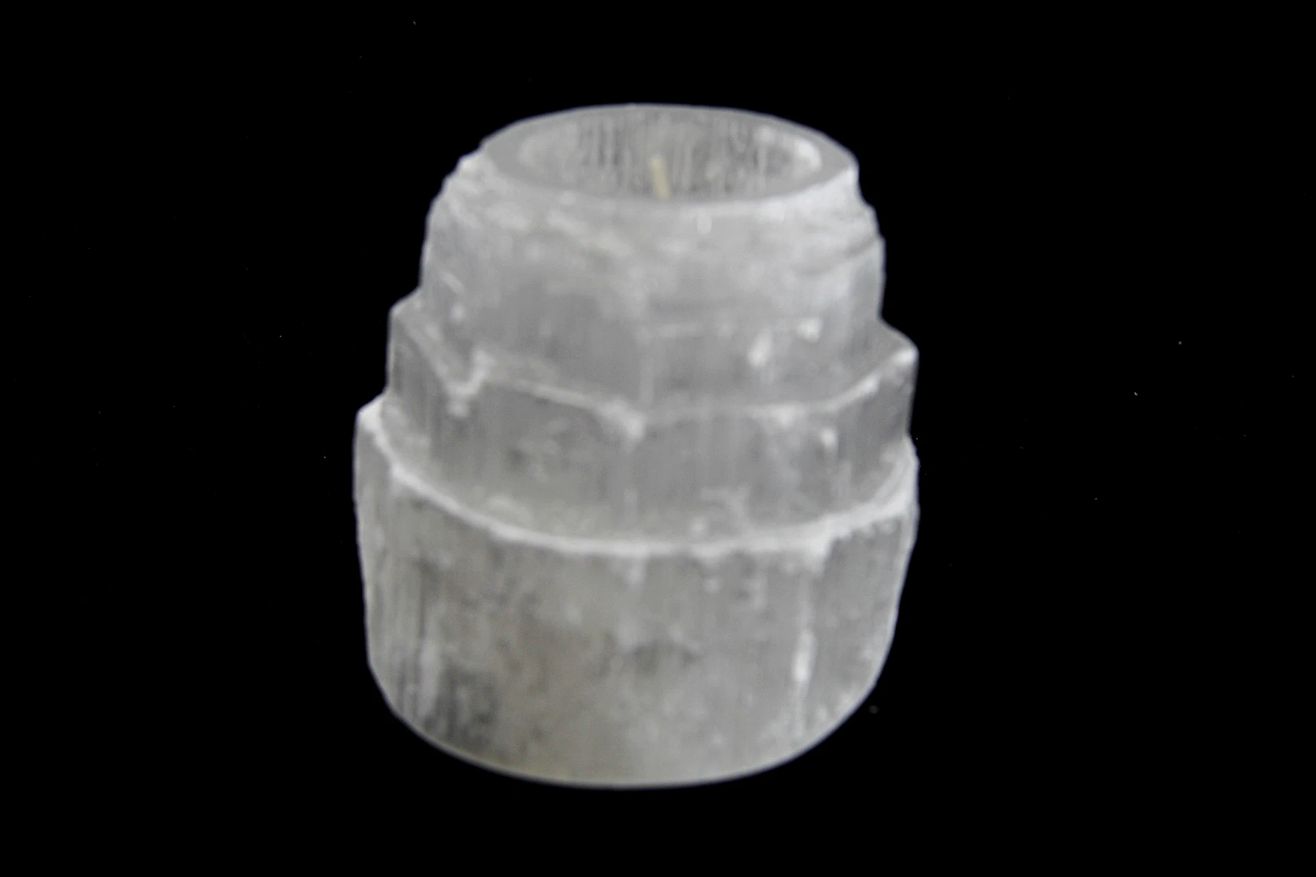 Castiçal em selenita em forma de torre, ideal para apoiar velas e criar uma iluminação suave e acolhedora.