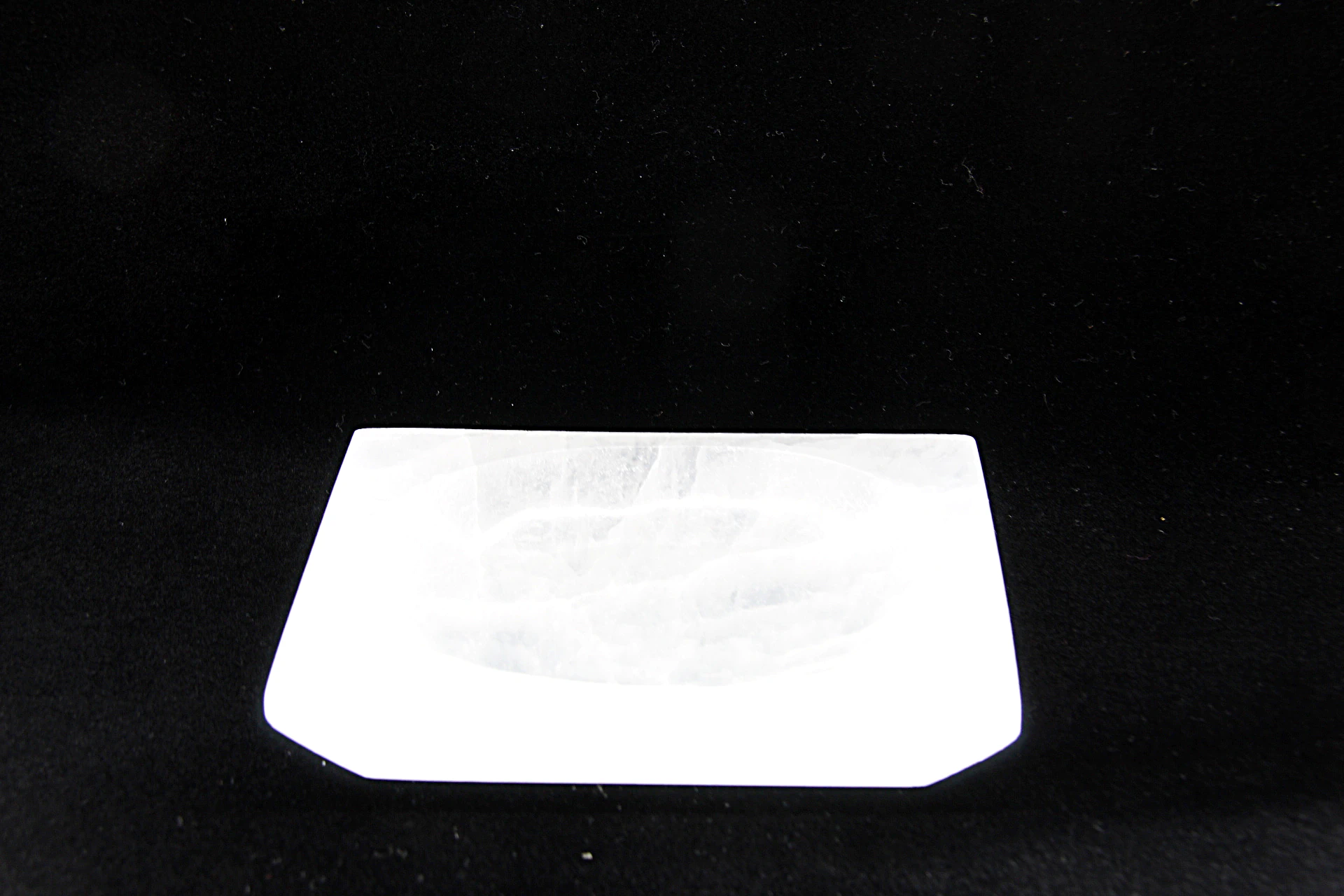 Taça em selenita com formato retângular, ideal para velas, cristais ou pequenos objetos energéticos.