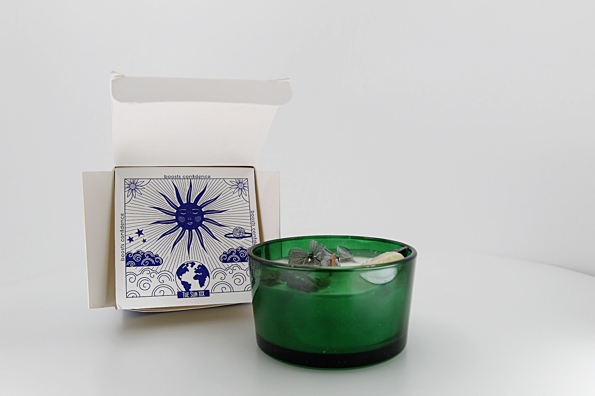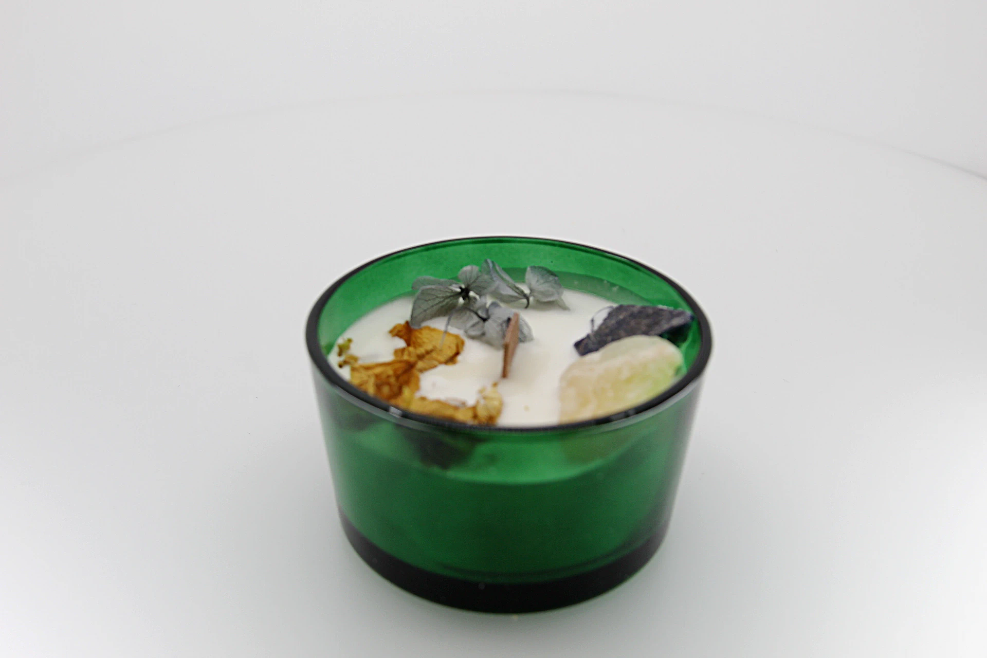 A vela floral com cristais – Sol combina cera de soja, pétalas naturais e pedras como citrino e sodalite para criar um aroma luminoso e revitalizante no seu espaço.